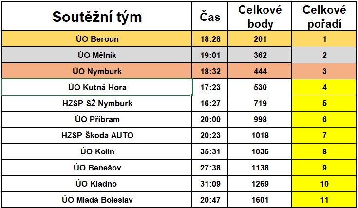 Po napínavém boji se na třetím místě umístil soutěžní tým územního odboru Nymburk, stříbrnou příčku obsadilo družstvo územního odboru Mělník a na první příčce se překvapení nekonalo a vítězi se s výrazným náskokem stali favorizovaní hasiči z územního odboru Beroun.