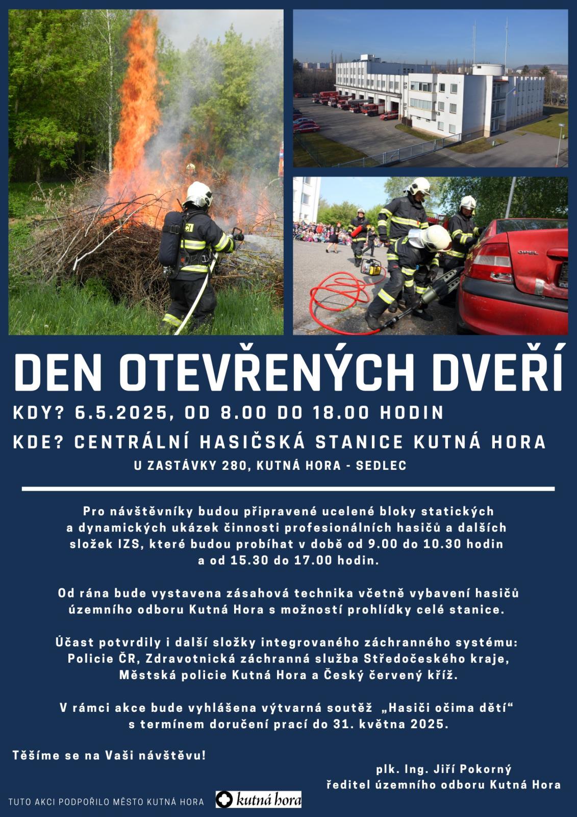 Hasičský záchranný sbor Středočeského kraje územní odbor Kutná Hora pořádá den otevřených dveří na centrální hasičské stanici Kutná Hora.