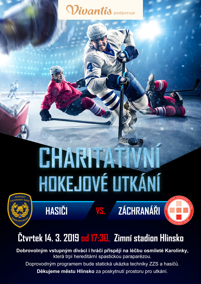 Další charitativní hokejové utkání rozehŕají ve čtvrtek 14. března 2019 hasiči. Tentokrát budou hasiči hrát proti zdravotníkům. Hrát se bude na Zimním stadionu v Hlinsku. Dobrovolným vstupným diváci i hráči přispějí na léčbu osmileté Karolínky, která trpí hereditární spastickou paraparézou.