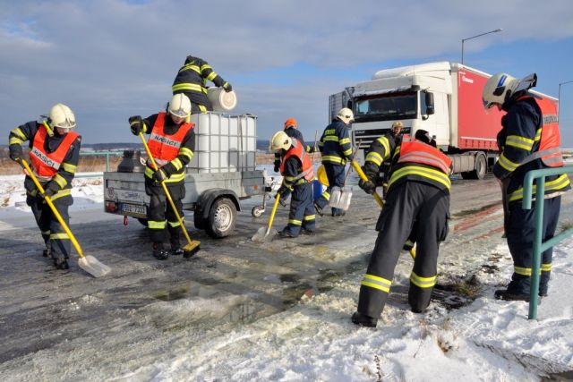 19.12. 10:37 Hasičské jednotky HZS PS Varnsdorf a SDH Rumburk uklízely uniklou naftu z porušené nádrže kamionu u kruhového objezdu nedaleko Čerpací stnice Shell u Rumburka.