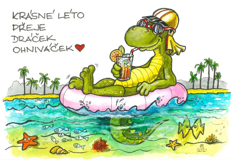 Za nádherný a letně laděný obrázek děkujeme naší dvorní malířce Míichaele Smetákové, která maskota – dráčka Ohniváčka, pro hasiče maluje již řadu let.