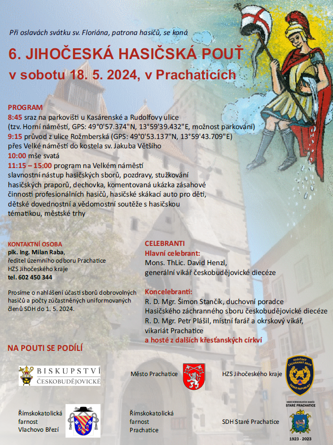 Blíží se výročí svátku sv. Floriána a my si vás dovolujeme pozvat na 6. jihočeskou hasičskou pouť, která se koná v sobotu 18. května 2024 v Prachaticích. Bude připravený bohatý duchovní i hasičský program pro dospělé i děti.