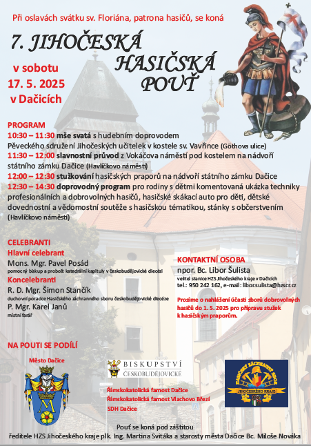 Blíží se výročí svátku sv. Floriána a my si vás dovolujeme pozvat na 7. jihočeskou hasičskou pouť, která se koná v sobotu 17. května 2025 v Dačicích. Bude připravený bohatý duchovní i hasičský program pro dospělé i děti.