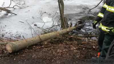 Největší komplikací a nebezpečím pro obsluhovatele motorové řetězové pily byl v tomto případě kořenový bal vyvráceného stromu. Proto bylo nutné jej pomocí lesnického stahováku a silové kladky zajistit a po odřezání kmene vrátit do původní polohy, aby nedocházelo k dalšímu sesuvu břehu. Posléze bylo opět pomocí lesnického stahováku přikročeno k postupnému vytahování kmene stromu ze zamrzlé hladiny a jeho postupnému odřezávání. I v této fázi byla vzhledem k zamrzlé hladině rybníka použita silová kladka.