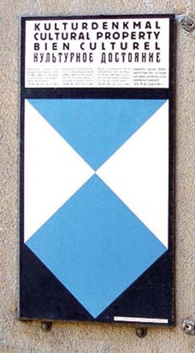 Pro identifikaci kulturních hodnot Úmluva uvádí možnost opatřit je rozeznávacím znakem – štítem dole zahroceným, uhlopříčně rozděleným na čtyři pole modré a bílé barvy. Znak se používá pouze jednotlivě nebo v trojúhelníkovém seskupení.