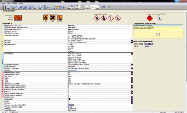 Souhrnným způsobem zpracovávají informace databáze nebezpečných látek, které zahrnují jak informace vycházející z legislativních předpisů, tak i číselné údaje o vlastnostech látek. Čtvrtletní aktualizaci, která se vždy snaží respektovat změny, které vycházejí především z EU, zahrnuje již téměř dvacetiletá databáze firmy Medistyl, s.r.o., distribuovaná pod označením MEDIS-ALARM, v letošním roce ve verzi MEDIS-ALARM 111, jejíž úvodní stránka je na ukázku uvedena.