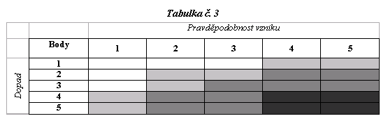Tabulka 3 vzniká přenosem údajů k součinu ohodnocení pravděpodobnosti vzniku (P) a ohodnocení nežádoucího dopadu (D) každého rizika do jednoduché matice. Výstupem matice je rozdělení řešitelnosti a interní dělby práce, předurčující, že rizika s počtem bodů: