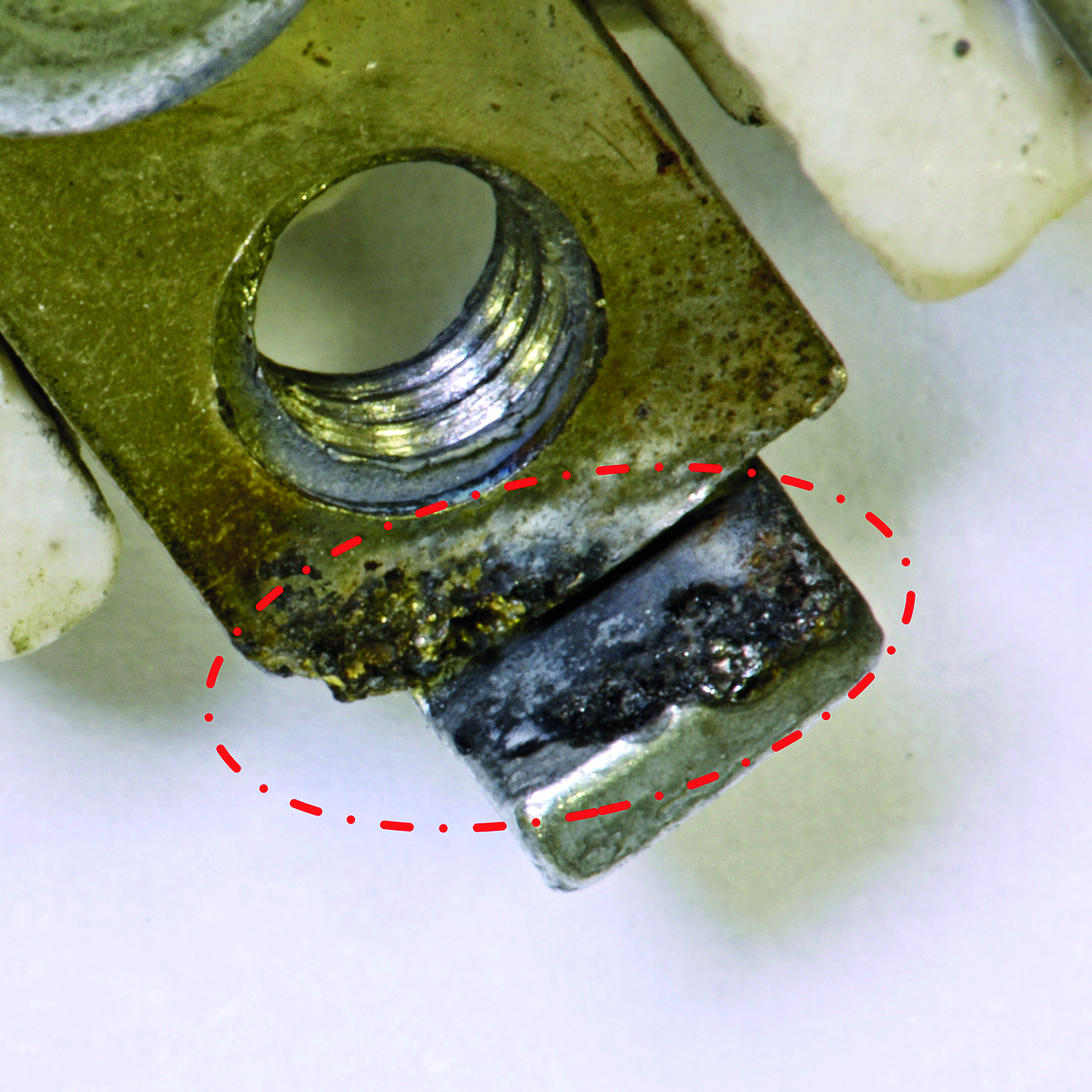 Obr. 2 Stopy tavení kontaktu zásuvky následkem průchodu elektrického proudu přes přechodový odpor