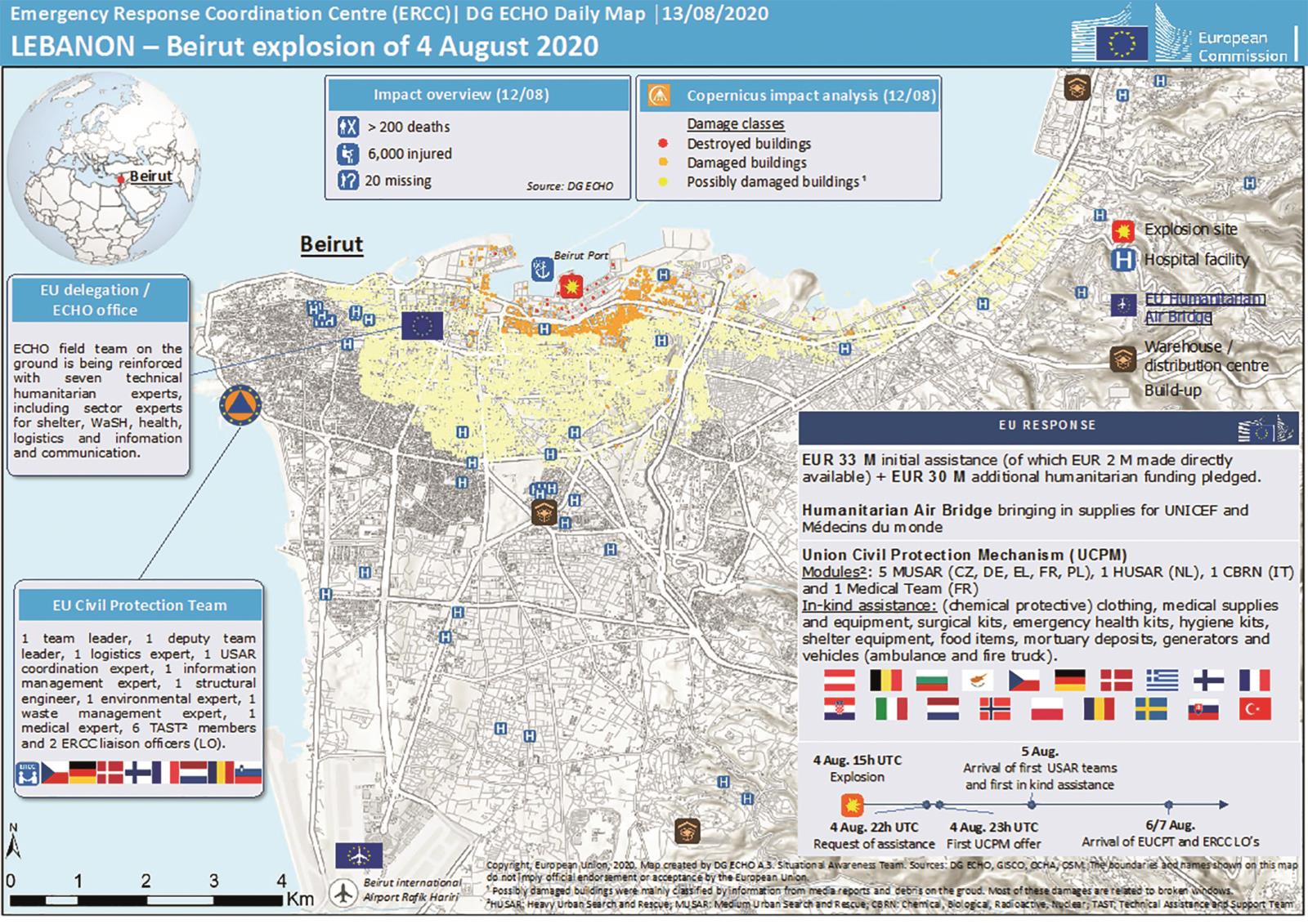Evropské země zareagovaly velmi rychle a na místo události vyslaly okamžitě celkem 6 USAR týmů, 1 lékařský tým a 1 speciální CBRN tým pro detekci nebezpečných látek na místě výbuchu. Součástí pomoci lidem v Libanonu byla i humanitární pomoc ve formě ochranných oděvů, zdravotnického materiálu, vybavení pro výstavbu nouzového ubytování, elektrocentrály, ale i hasičské a sanitní vozy. Zároveň byla aktivována i síť satelitů programu Copernicus, jejichž snímky pomohly při analýze následků výbuchu.