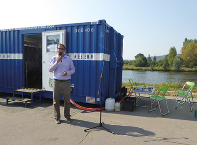 S technickými parametry úpravny vody seznámil Ing. Martin Kubišta z firmy AQUACON, která zajišťuje prodej a instalaci úpraven vod a poskytuje konzultační a poradenskou činnost. Mobilní úpravna vody - VIWA 5 STANDARD může připravit kvalitní pitnou vodu, která odpovídá směrnici WHO (Světová zdravotnická organizace) pro jakost pitné vody, až pro 5 000 obyvatel. Plně automatický řídicí a kontrolní systém lze velmi rychle uvést do provozu. Doba aktivace úpravny je maximálně dvě hodiny. Kontejnerové provedení s veškerým komfortem pro obsluhu je navrženo pro polní podmínky (kontejner je přepravitelný na podvalníku a manipulovatelný jeřábem o nosnosti 10 tun). Přepravní hmotnost činí 7300 kg, zdroj elektrické energie 230 V/400 V, 50 Hz (celkový instalovaný příkon 15 kW), instalace je možná na zpevněnou plochu o velikosti 15 m2. Součástí úpravny je integrovaná akumulační nádrž upravené pitné vody o objemu 3000 l a příruční laboratoř pro jednoduchou laboratorní kontrolu provozu z hlediska kvality vyráběné vody. Úpravna může být instalována na podzemní zdroj pitné vody (vrt), nebo uměle vytvořený zdroj (přehrada). Čerpadlo vstupní vody a hadice umožní čerpání do vzdálenosti 18 m od zdroje vody ke kontejneru a rozdílu geodetické výšky 25 m. Úprava vody spočívá v separaci nerozpustných látek koagulací a sedimentací kalu technologickým procesem čiření, pískovou filtrací a flokuací, kdy se z destabilizovaných částic tvoří usazující se vločky. Dochází k odstraňování těžkých kovů (provzdušněním a filtrací). Dalším stupněm úpravy je sorpce na aktivním uhlí a dvojstupňová dezinfekce (fyzikální UV zářením a chemická chlorací).