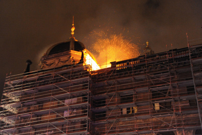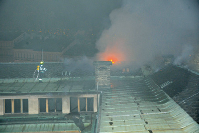 Po dosažení úrovně střechy a překonání balustrády zahájila jednotka ze stanice Sokolská hašení oběma útočnými proudy. V místě napojení sedlové střechy na rohovou věž s kopulí došlo již k celkovému prohoření střešního pláště, a proto rozhodl VZ o přesunutí těchto proudů do vnitřních prostor podkroví k dosažení maximálního efektu postupu prací. Od zasahujících hasičů tento krok vyžadoval vrcholné nasazení, což mělo v konečném důsledku rozhodující vliv na vzniklé škody. Ke zvýšení hasebního účinku použili hasiči na útočných proudech zpočátku smáčedlo.