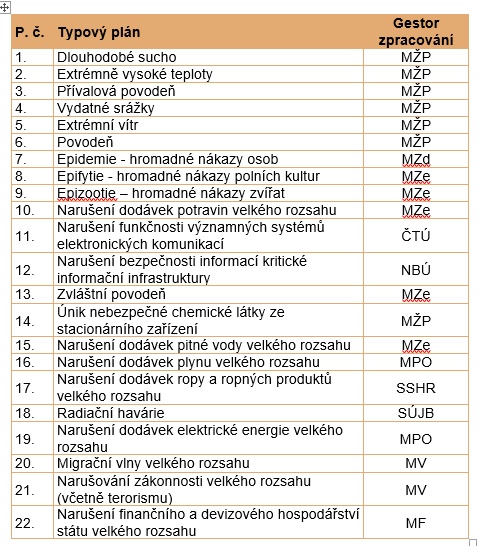 Jedním z úkolů, stanovených v Koncepci ochrany obyvatelstva do roku 2020 s výhledem do roku 2030, schválené usnesením vlády ze dne 23. října 2013 č. 805, bylo „Zpracovat analýzu hrozeb pro Českou republiku a její závěry promítnout do metodických a strategických materiálů v oblasti bezpečnosti státu“. Gestorem tohoto úkolu bylo MV­ GŘ HZS ČR, které ve spolupráci s dotčenými ministerstvy a ústředními správními úřady zpracovalo předmětnou analýzu. V této byly nově posouzeny typy nebezpečí, které se mohou na území České republiky vyskytovat a bylo identifikováno 22 typů nebezpečí, pro které lze odůvodněně očekávat vyhlášení krizového stavu. Došlo tedy k přehodnocení druhů krizových situací, pro které bude nezbytné zpracovat typový plán. Tuto Analýzu hrozeb pro Českou republiku schválila vláda svým usnesením ze dne 27. dubna 2016 č. 369, v němž uložila ministru vnitra aktualizovat do 31. prosince 2016 Metodický pokyn ke zpracování typových plánů a dotčeným ministrům a vedoucím ústředních správních úřadů (1. místopředseda vlády pro ekonomiku a ministr financí, ministři vnitra, životního prostředí, zemědělství, zdravotnictví, průmyslu a obchodu, předsedkyně Státního úřadu pro jadernou bezpečnost, předseda Správy státních hmotných rezerv, ředitel Národního bezpečnostního úřadu a předseda Rady Českého telekomunikačního úřadu) uložila zpracovat do 31. prosince 2017 nové typové plány pro oblast jejich působnosti podle již zmíněného nového metodického pokynu.