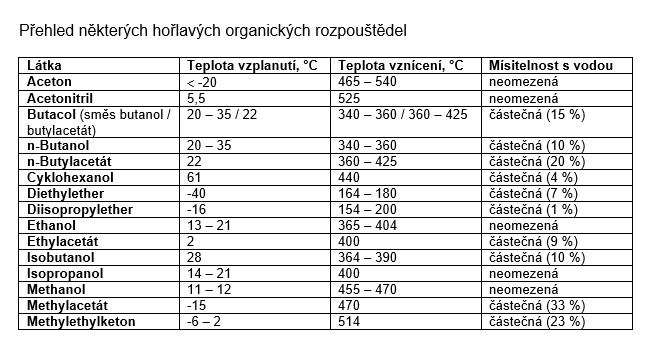 Tabulka dokazuje vysokou hořlavost některých organických rozpouštědel. Širokou dostupnost dokumentují rozmanitá balení prodávaných látek od 0,5 do 10 litrů v maloobchodní síti až po 200 l sudy nebo cisterny pro průmyslové použití.