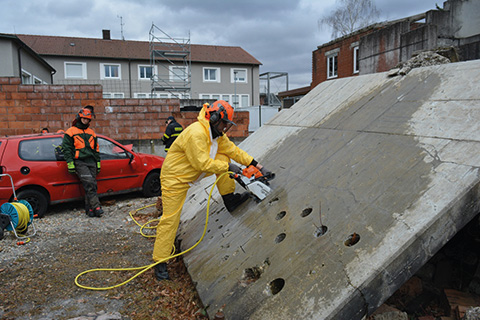 Pobyt naší skupiny probíhal i přes nepřízeň počasí ve znamení praktického výcviku, jehož náplní byly různé způsoby kácení stromů se zaměřením na bezpečnost práce, která je na rozdíl od běžné těžby, kde převažuje měřítko kvantity, v záchranářské činnosti prvořadá. Stejně tak je tomu i v našich podmínkách. Obtížnost témat výcviku se stupňovala, po vzájemném seznámení se s metodikou kácení na obou stranách byla činnost doplněna o používání přenosného navijáku při odstraňování zavěšených nebo popadaných stromů a celé jedno odpoledne bylo věnováno též využití záchranářské pily STIHL MS 460 RHD a řezání betonu speciální motorovou pilou, která je chlazena vodou a osazena řetězem s diamantovými polštářky. Této části výcviku se účastnil i vývojový inženýr firmy STIHL, kterého zajímaly jak kladné, tak záporné zkušenosti uživatelů motorových pil značky STIHL.