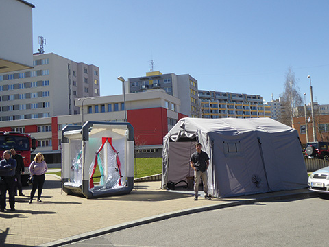 O současných trendech ve výrobě nafukovacích záchranných stanů informoval Pavel Polák z akciové společnosti Gumotex. Řekl, že základním požadavkem není pouze nízká cena, ale také nízká celková hmotnost, kdy stan by měl být co nejmenší i při dobrém plnění své funkce (downsizing). Další rozhodující parametry jsou druh tkaniny, její váha a pevnost při trhání, adheze (přilnavost), barva, odolnost proti oděru a proti UV záření, proti plísni, vzduchotěsnost, dostupnost náhradních dílů a také snadné udržování. Ke spojování jednotlivých dílů se používá standardně šití a lepení, ale také nových technologií svařování (horkovzdušné a velmi přesné vysokofrekvenční). Kvalita těsnosti spojení se testuje ve vodě. Novým typem jsou také stany s nafukovací konstrukcí (nafukování kompresorem nebo tlakovou lahví) a systémem podvěšených válců.