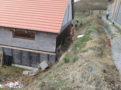 Vyprošťovací práce byly zahájeny v 11.30 hodin. Po zadokumentování situace Policií ČR byla zadním podkopem stroje pro zemní práce odtěžena část svahu a částečně vyplněn výkop na rohu spodní budovy. Po vyčištění přístupu se bagristovi podařilo odstranit i část prefabrikovaných betonových svahových tvárnic, čímž zasahujícím velmi ulehčil další postup. Tvárnice v bezprostřední blízkosti zavalených pak byly po zapažení odstraněny ručně.