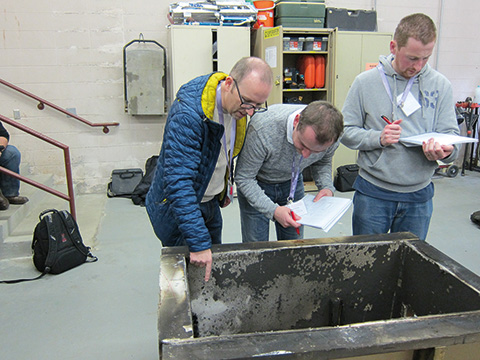 Na místě čeští vyšetřovatelé byli zařazeni do šesté skupiny, kde společně mj. s Michaelem Wixtedem (spoluautorem řady publikací NFPA zaměřených na problematiku požární ochrany), který je původem z Irska, vytvořili „evropský vyšetřovací mini tým“. Naše skupina odstartovala dopolední činnost na pracovišti č. 1. Zaměstnání v této skupině vedl Wayne Chapdelaine z NAFI, který posluchače v teoretické části nejdříve seznámil s požární dynamikou. Na tu navazovala již praktická ukázka požární dynamiky při simulovaném požáru v předem připraveném objektu, jenž byl modelován jako dětský pokoj. Místo zásahu bylo situováno do lodního kontejneru, jehož stěny a strop byly obloženy sádrokartonovou konstrukcí. Z jedné strany byl kontejner otevřený, aby mohl být požár dobře sledovatelný z pozorovacího stanoviště. Vnitřní prostor byl vybaven kobercem, patrovou postelí, čalouněným křeslem, psacím stolem a židlí. Při ukázce se měřila teplota uvnitř kontejneru pomocí termočlánků napojených do mobilního vyhodnocovacího centra EKU. Požár byl také monitorován termokamerou. Během ukázky byla v pravidelných intervalech účastníkům kurzu hlášena teplota požáru. Ihned po uhašení požáru byl na LCD monitorech vyhodnocovacího centra zveřejněn graf průběhu teploty v závislosti na čase a Wayne Chapdelaine provedl zhodnocení jednotlivých parametrů požáru.