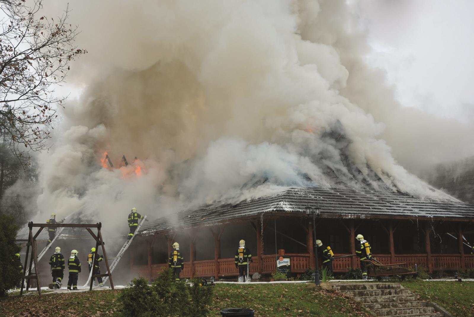 Během zásahu bylo uvnitř objektu nalezeno osm tlakových lahví se stlačenými plyny, které byly z objektu vyneseny. Při průzkumu byly v kuchyni také nalezeny barely s oleji, které se však už nepodařilo vynést ven a požár se vznícením těchto olejů zintenzivnil. Z objektu se začaly ozývat opakované menší či větší exploze a ve 12.30 hodin docházelo k borcení prvních střešních konstrukcí. Ve 12.51 hodin nařídil velitel zásahu stažení hasičů z vnitřku objektu a zásah byl nadále veden pouze z vnější strany.