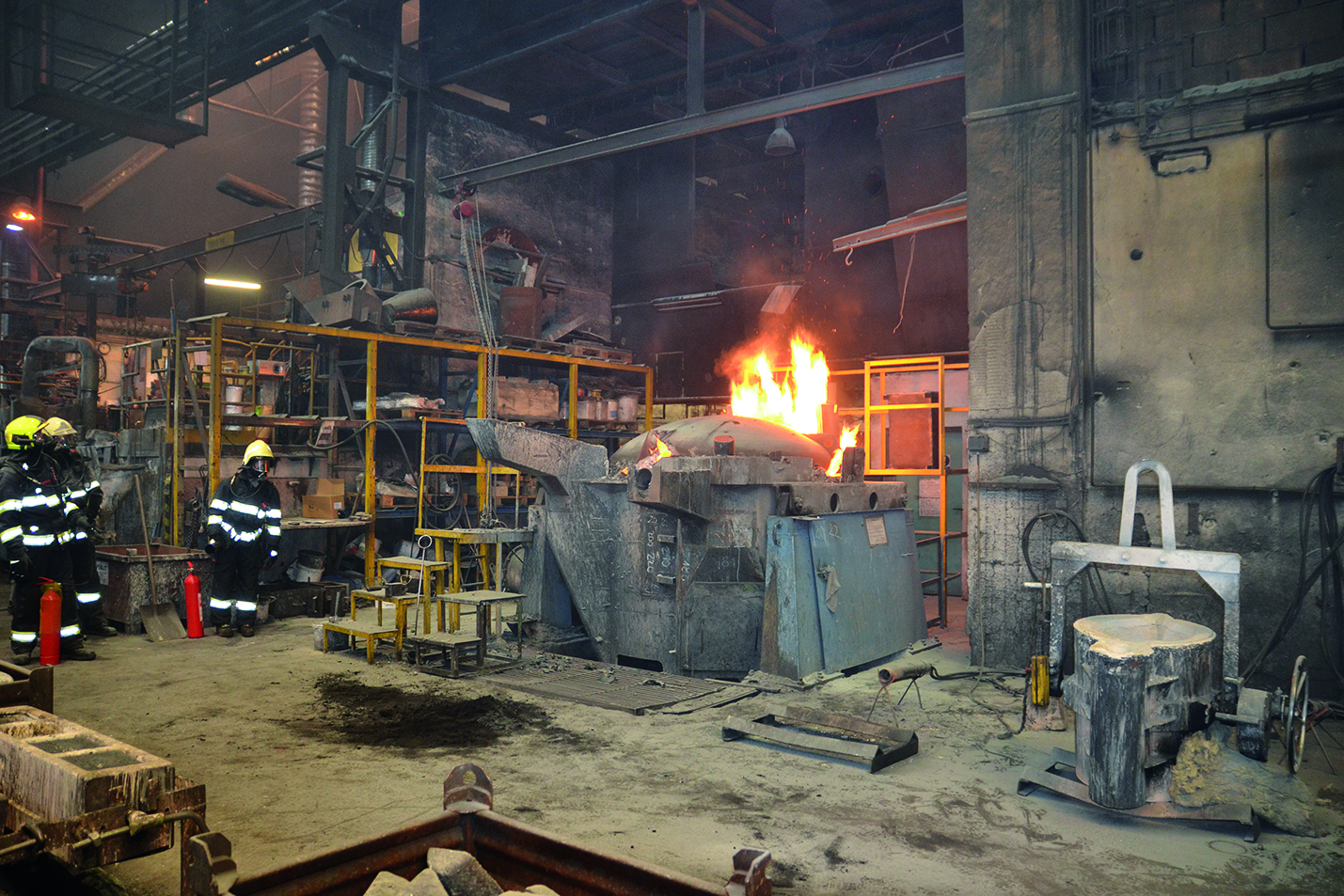 Po příjezdu na místo zásahu hasiči průzkumem zjistili, že jde o požár indukční tavicí pece v objektu slévárny. K plamennému hoření docházelo u víka pece, ve které bylo pět tun roztavené litiny o teplotě 1 900 °C. Zaměstnanci vypnuli elektrickou energii. Vodní chlazení pece ponechali v provozu. Následně se evakuovalo 36 osob pracujících v hale a v přilehlé brusírně. Žádná osoba nebyla zraněna ani pohřešována. Po konzultaci s mistrem provozu a jednatelem společnosti se hasiči pokusili zastavit plamenné hoření v okolí pece ručním práškovým hasicím přístrojem a přístrojem CO2. Prostředky nebyly dostatečně efektivní a nadále hořelo. Z tohoto důvodu se po dohodě s majitelem přistoupilo k postupnému vylévání roztavené litiny mimo pec. Dva zaměstnanci za dohledu jednotek PO vylévali litinu do připravených pískových forem a provizorních pískových hromad v prostoru haly. Ve skladovacím prostoru dřevěných modelů pro výrobu forem, který se nachází nad indukční pecí, se zahřívala ocelová podlaha a hrozilo, že se požár rozšíří do těchto míst. V tomto místě se zřídil úsek č. 2. Pro ochlazování byl připraven proud C a zahájila se evakuace dřevěných modelů z dosahu účinků sálavého tepla. Podlahu a kovové konstrukce monitorovala termokamera.