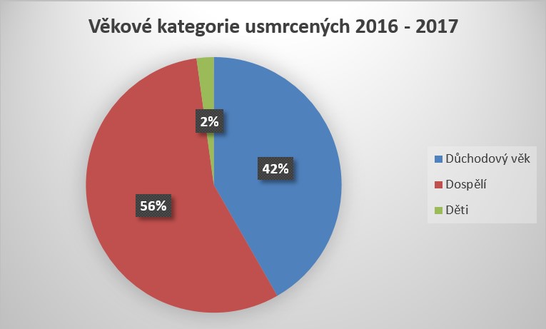 Věkové kategorie usmrcených osob jsou zcela triviální informací, která má však velký potenciál pro efektivní směřování preventivně výchovné činnosti a osvěty veřejnosti. Jakmile se tyto informace zobecní, dostaneme ještě lepší představu o rizikových kategoriích osob. V rámci této analýzy těžko narazíme na nějaká pozitiva, ovšem o určitém kladném náznaku lze hovořit v souvislosti s úmrtností nezletilých osob a dětí, kde je úmrtnost prakticky mizivá. Převládají osoby v produktivním věku a senioři, tedy osoby nad 65 let.