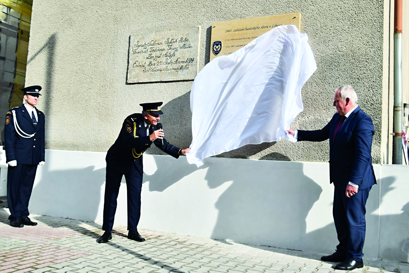 Fotografie požáru budovy libereckého celního úřadu v roce 1931společně primátor statutárního města Liberec Ing. Jaroslav Zámečník, CSc., a ředitel HZS LK plk. Ing. Luděk Prudil. U odhalení desky byl přítomen i Vladimír Drbohlav, bývalý obyvatel bytu, který byl původně součástí hasičské zbrojnice, kde bydlel společně s rodiči a jehož tatínek Antonín býval zastupujícím velitelem požárního sboru města Liberec. Během celého programu byla připravena statická ukázka nové požární techniky, kterou liberečtí profesionálové disponují. K vidění byl automobilový žebřík AZ 42 Iveco – Magirus. Ten byl spolufinancován z Evropských strukturálních a investičních fondů prostřednictvím Integrovaného regionálního operačního programu 2014–2020 a pořízen v projektu „Zvýšení připravenosti Hasičského záchranného sboru České republiky k řešení a řízení rizik způsobených změnou klimatu“, který je určen pro zásahy ve výškách a nad volnou hloubkou, technický automobil TA S1CH (spolufinancovaný z Evropského fondu pro regionální rozvoj prostřednictvím programu INTERREG V A Česká republika – Polsko 2014–2020, pořízen v projektu Bezpečné pohraničí), sloužící pro zásahy s nebezpečnými látkami, cisternová automobilová stříkačka CAS 20/4000/240-S2T SCANIA (pořízena z Fondu zábrany škod) a pásové obojživelné vozidlo HÄGGLUNDS BV206, které je určeno k zásahům v těžce přístupném terénu a při povodních. Výstavu požární techniky doplnil jablonecký veterán z roku 1918 PRAGA typ L. Po skončení oficiálního programu byla připravena výstava dobových fotografií liberecké hasičské historie v prostorech ředitelství HZS LK.