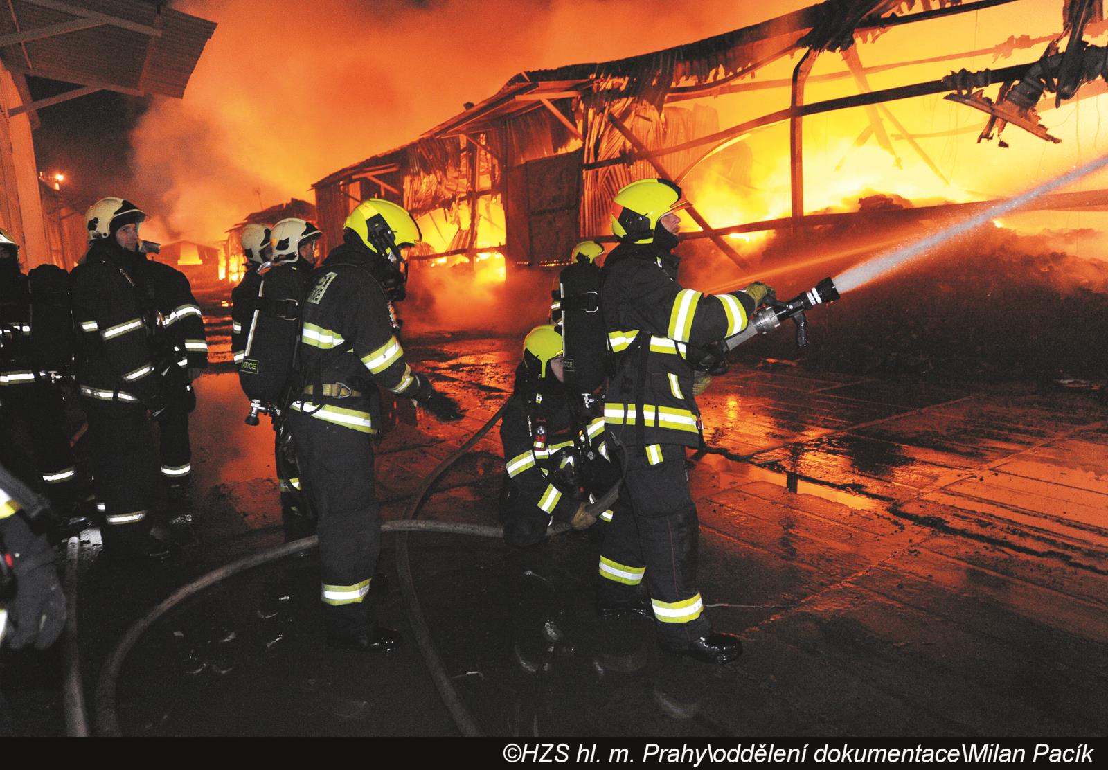 Vzhledem k tomu, že šlo o uzavřený areál skladovacích hal s jednou příjezdovou cestou a vzhledem k rozsahu a rychlosti šíření požáru, rozhodl velitel zásahu (VZ) o bezpečném ustavení požární techniky před vjezdem do areálu. Současně byly rozbrušovacími agregáty v prolukách protilehlých hal pro zasahující příslušníky vytvořeny dvě únikové cesty. Po vyhodnocení situace, s ohledem na rozsah požáru a počáteční nedostatek sil a prostředků (SaP), dal VZ rozkaz zaujmout obranné postavení s cílem zabránit rozšíření požáru na další příčně navazující halu a na protilehlé haly areálu. Byl vydán rozkaz k vytvoření dopravního vedení dvěma proudy C a jedním proudem po AZ-30. V průběhu zásahu na místo dojížděly jednotky PO, které byly směrovány přes sousedící areál betonárky na druhou stranu hořící haly. Všechny práce probíhaly v izolačních dýchacích přístrojích (IDP). Ve 12.27 hodin se na místo dostavil velicí důstojník směny (VDS), který převzal velení zásahu a zřídil štáb velitele zásahu v ulici Pramenná v areálu přilehlé betonárky. O vývoji na místě události informoval OPIS MV-generálního ředitelství HZS ČR, Operační středisko krizového štábu Magistrátu hl. m. Prahy, krajského řídicího důstojníka a ředitele HZS hl. m. Prahy. Ve 12.31 hodin byl vyhlášen 3. stupeň požárního poplachu a místo zásahu bylo rozděleno na tři úseky.