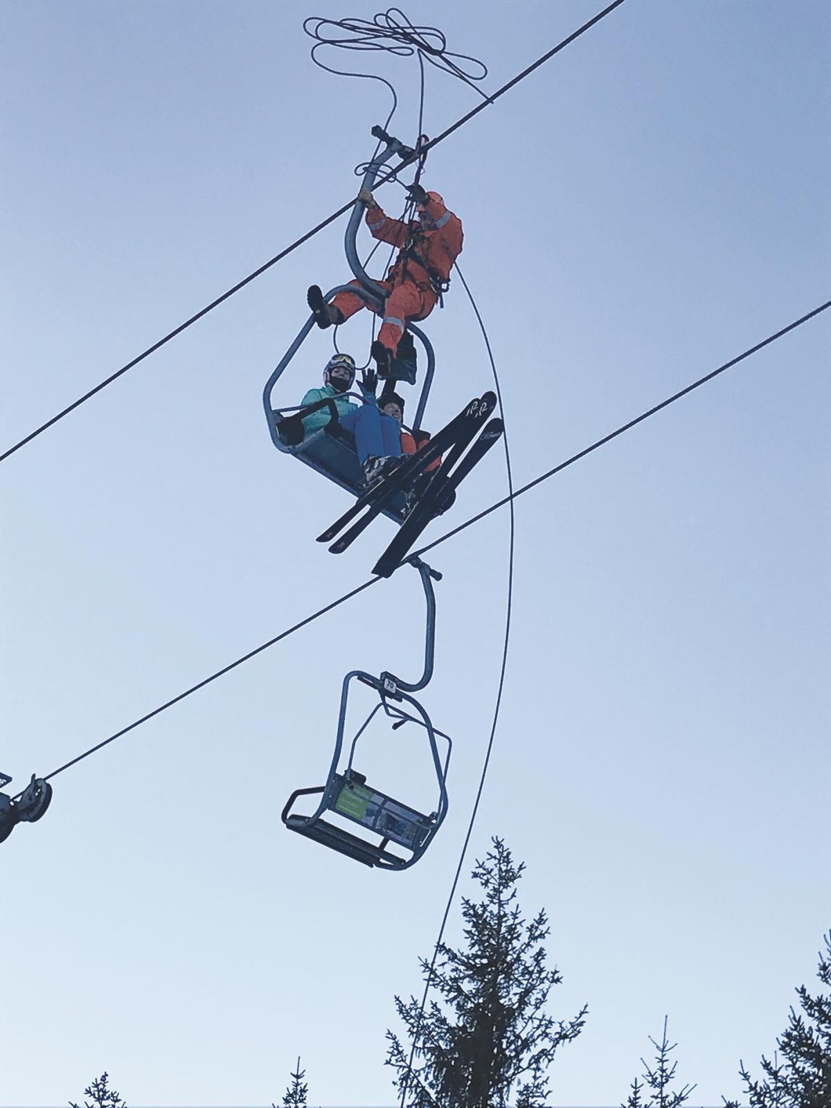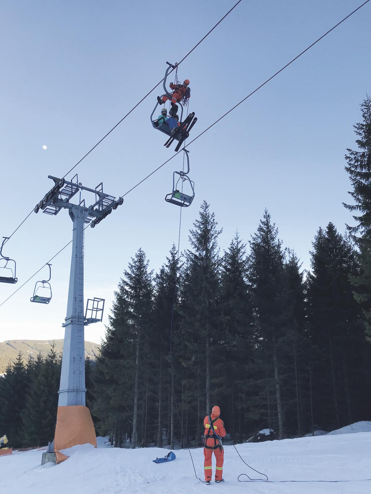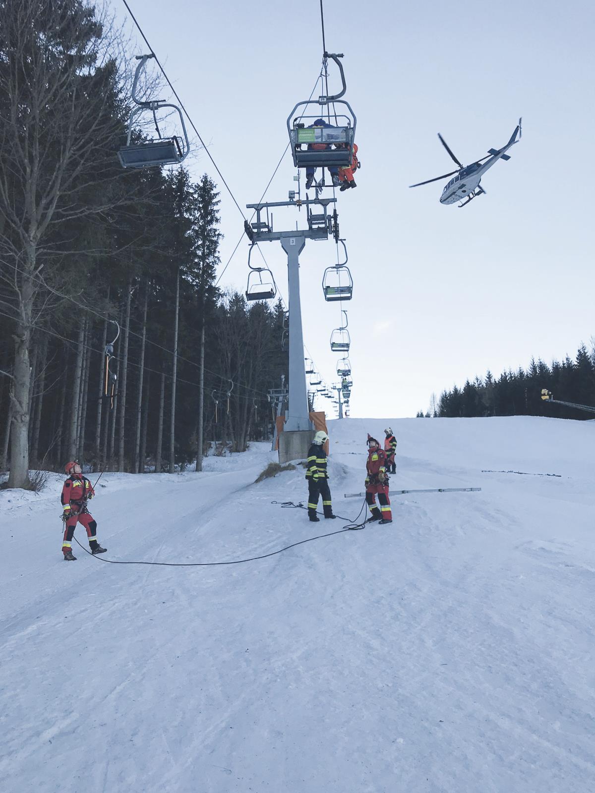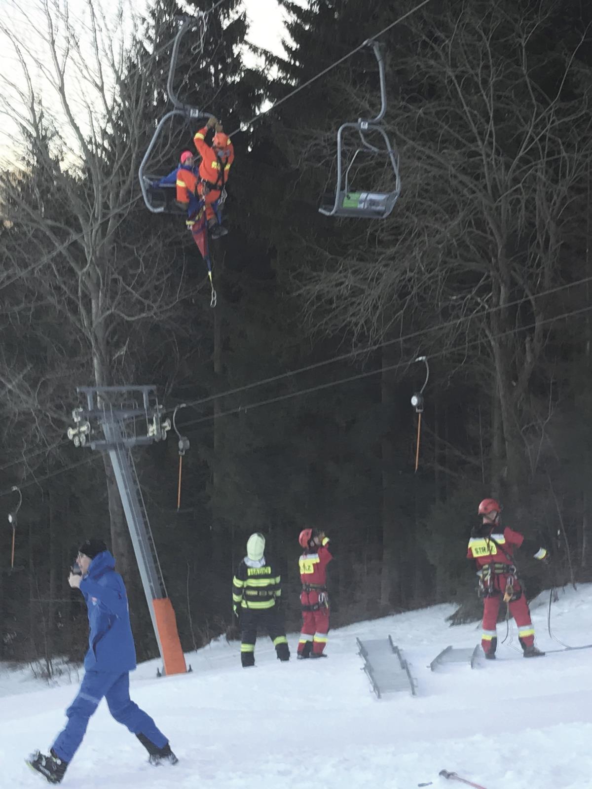 Po příjezdu na místo události se velitel zásahu spojil s majitelem skiareálu, který mu sdělil, že na sedačkách lanovky zůstalo nakonec asi 40 lyžařů nerovnoměrně rozmístěných na všech devíti úsecích LD. Provozovatel areálu nasadil prioritně veškeré zaměstnance na záchranu osob pomocí žebříku z plošiny sněžné rolby. Následně byly po příjezdu jednotlivých skupin záchranářů vytvořeny dvoučlenné týmy a ty pak rozvezeny sněžnými skútry a motorovou čtyřkolkou na jim určené úseky LD. Záchrana byla prováděna převážně přiblížením lezce z řad hasičů nebo členů HS k sedačce lanovými kladkami Petzl Rollcab a následného spuštění zachraňované osoby na zem v evakuačním pásu nebo šátku. V místech dostupných žebříkem byly osoby zachraňovány jeho přistavením a po zajištění osoby jejím sestupem po žebříku. Záchrannou akci významně ztěžoval zledovatělý povrch sjezdovky, kde zejména na strmějších pasážích hrozil pád zasahujících při jištění kolegů nebo při jejich přesunu po sjezdovce. V úplném závěru záchranné akce přiletěl na místo také vrtulník, z jehož paluby se k zachraňované osobě spustil v podvěsu letecký záchranář a následně byli společně vytaženi na palubu stroje. Poslední osoba byla z LD zachráněna v 16.46 hodin, kdy slunce zapadlo za horizont a citelně se snížila teplota vzduchu, což by v konečném důsledku mělo negativní dopad na tepelný komfort osob na sedačkách LD.