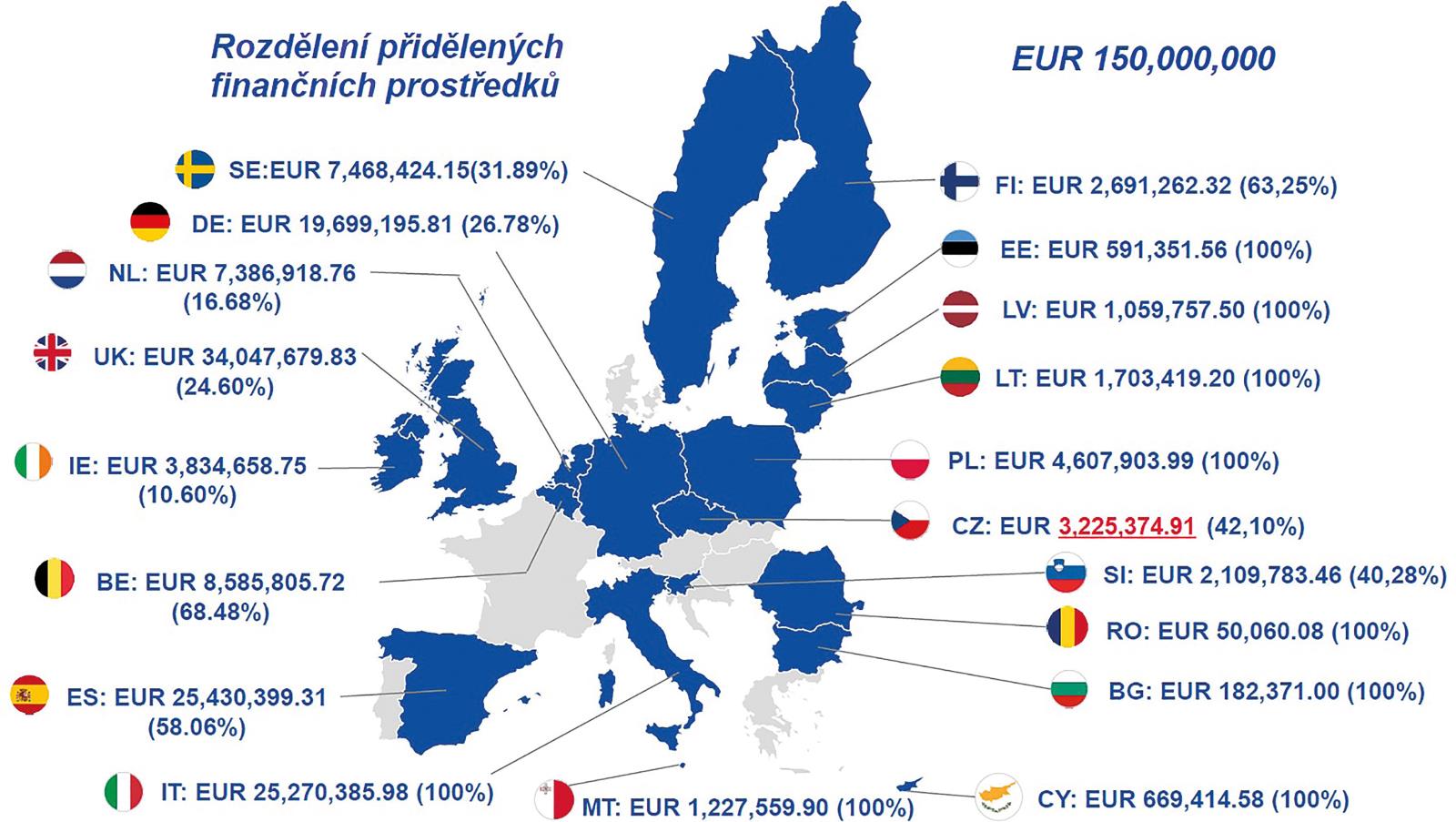 Na obrázku je shrnuto, jak bylo 150 miliónů eur rozděleno mezi členské státy, které požádaly o refundaci nákladů za přepravu zdravotního materiálu. Přihlédneme-li ke skutečnosti, že ČR zvládla první vlnu pandemie covid-19 bez významnějšího zvýšení počtu úmrtí, tak lze 42,1 % z celkové požadované částky získané od Evropské komise považovat za úspěch.