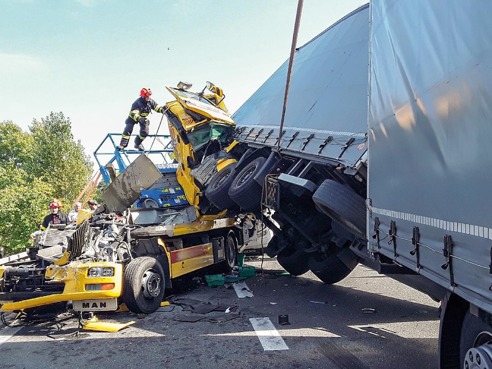 Šlo o řetězovou dopravní nehodu dvou tahačů s návěsem, jednoho NA s přívěsem, jednoho NA určeného k odtahování havarovaných vozidel, jednoho osobního automobilu a jednoho dodávkového automobilu. Operační a informační středisko HZS JmK vyslalo k MU jednotky ze stanic HZS JmK Pozořice s CAS 20, Slavkov u Brna s CAS 20, Vyškov s TA-L, Brno-Líšeň s CAS 15 a RZA a Brno-Lidická s CAS 20 a TA-S. První jednotky požární ochrany (PO) ze stanic Slavkov u Brna a Pozořice dorazily na místo zásahu v 11.47 respektive v 11.48 hodin a průzkumem zjistily, že se v kabinách dvou NA nacházejí dva zaklínění řidiči. Jedna z kabin NA byla vlivem silného nárazu utržena a zůstala doslova viset ve výšce asi 3,5 m, navíc byla zaklíněna nestabilním návěsem. Ve druhé kabině NA byl zaklíněný řidič, který narazil do NA prudce brzdícího před ním. Kabina byla nárazem zcela zdeformována. Oba řidiči byli viditelně zranění, ale při vědomí. Na místo zásahu se postupně dostavily všechny vyslané jednotky PO, posádky Zdravotnické záchranné služby (ZZS) JmK a příslušníci Policie České republiky (PČR). Již během průzkumu bylo zřejmé, že vyprošťování bude velmi náročné a zdlouhavé. Po konzultaci s lékařem ZZS JmK byla určena priorita vyprošťování jednotlivých řidičů. Oba byli při příjezdu hasičů při vědomí a komunikovali. Velitel zásahu (VZ) rozdělil místo události na dva úseky, a to u každého zaklíněného řidiče. Na úseku 1 (zadní náraz) byly nasazeny hned tři sady vyprošťovacího zařízení, a to jak klasické hydraulické, tak i na akumulátorový (AKU) pohon. VZ rozhodl o vytvoření přístupu z boku a zároveň také ze zadní části kabiny. Tam je konstrukčně nejslabší místo a ideální prostor pro vytažení řidiče, pokud to umožní charakter převážejícího nákladu. V tomto případě šlo o balené pelety naskládané na paletách. Náklad byl postupně ručně vyskladněn z prostoru u kabiny. Zajistil se tím prostor pro práci hasičů a mohlo se přistoupit k vyproštění. Přímočarou a okružní AKU pilou se vytvořil vstup za zády řidiče. Po složitém a postupném vyprošťování se z boční strany podařilo řidiči uvolnit větší část těla. Zůstala mu však zaklíněná dolní končetina pod palubní deskou. Na její uvolnění byly nasazeny dva rozpěrné válce, rozpínák a střihač pedálů. Ve 13.36 hodin byl řidič vyproštěn z kabiny přes nákladový prostor na páteřové desce a předán do péče ZZS JmK. To vše probíhalo v extrémních tepelných podmínkách vyhřátého prostoru návěsu po dobu asi 100 minut. VZ proto povolal na místo zásahu dopravní automobil ze stanice Vyškov s dostatečným množstvím ochranných nápojů pro zasahující hasiče.