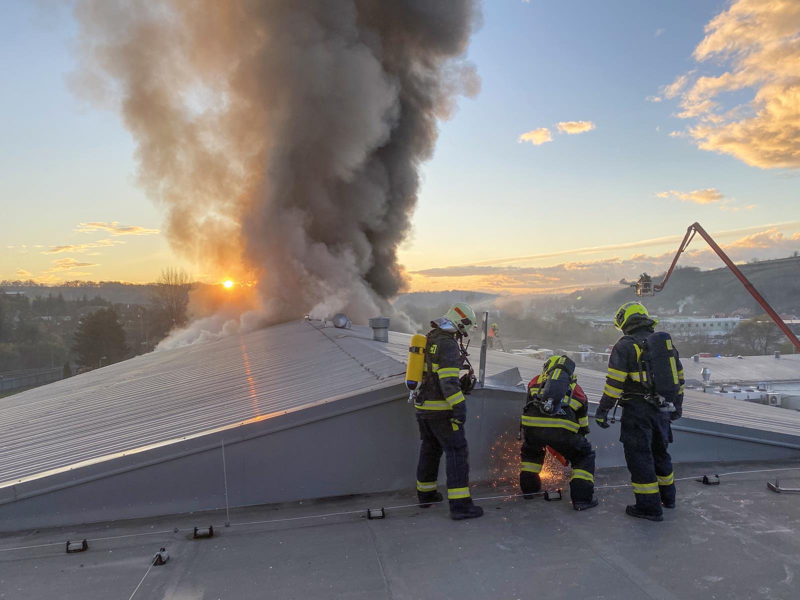 - zřícení střešní konstrukce – riziko pro zasahující hasiče a nízká účinnost aplikace hasební látky z výškové techniky,