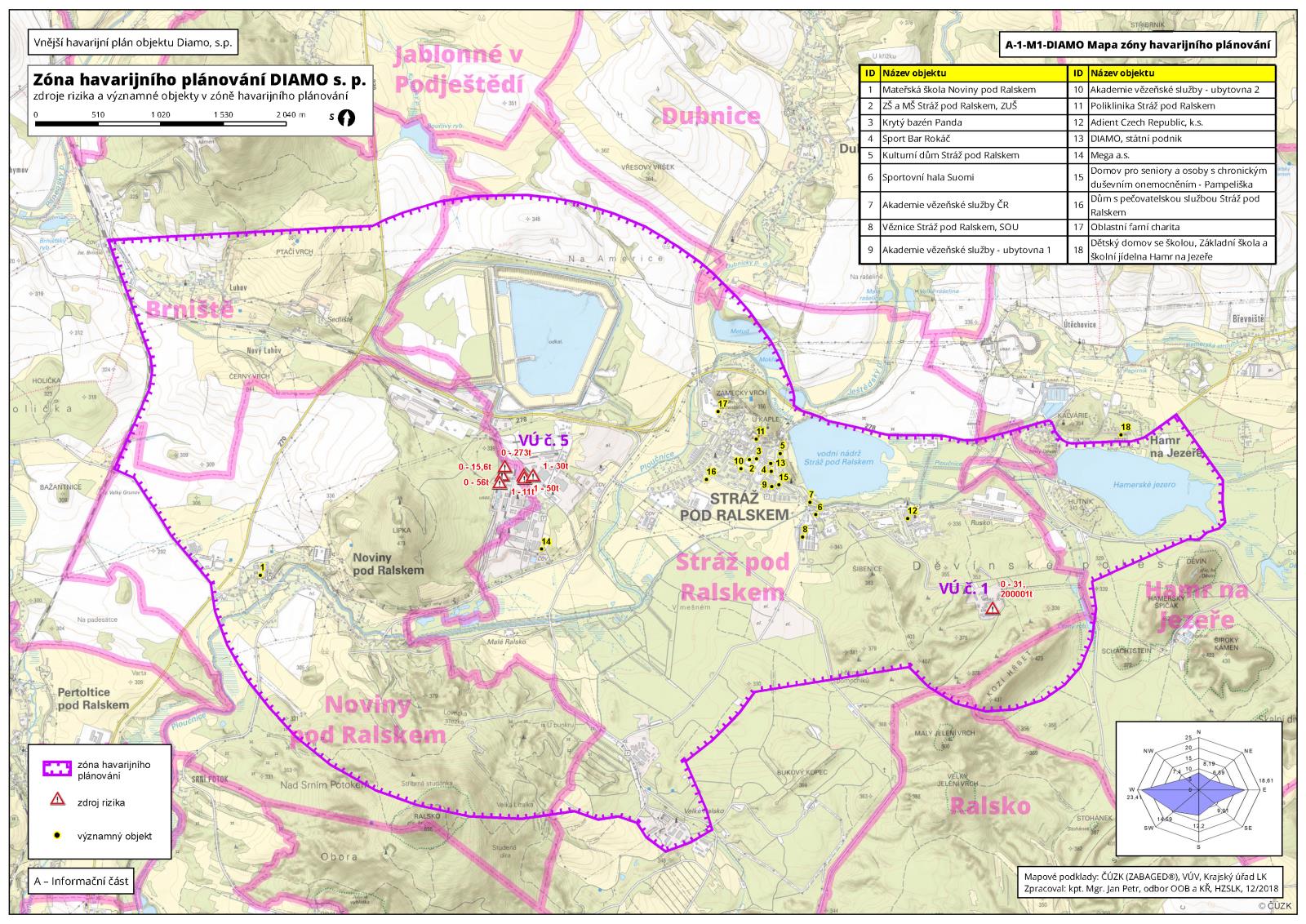 Podnik Diamo, s. p., je podle zákona č.224/2015 Sb., o prevenci závažných havárií způsobených vybranými nebezpečnými chemickými látkami nebo chemickými směsmi a o změně zákona č. 634/2004 Sb., o správních poplatcích, ve znění pozdějších předpisů (zákon o prevenci závažných havárií), zařazen do kategorie „B“ a vztahuje se na něj povinnost mít zpracovaný vnější havarijní plán (VHP). VHP zpracoval v letech 2017–2018 Hasičský záchranný sbor Libereckého kraje (HZS LK). VHP byl projednán na Bezpečnostní radě obce s rozšířenou působností (ORP) Česká Lípa a následně v červenci 2018 schválen starostkou města Česká Lípa. VHP byl předán na ORP a příslušné obce.