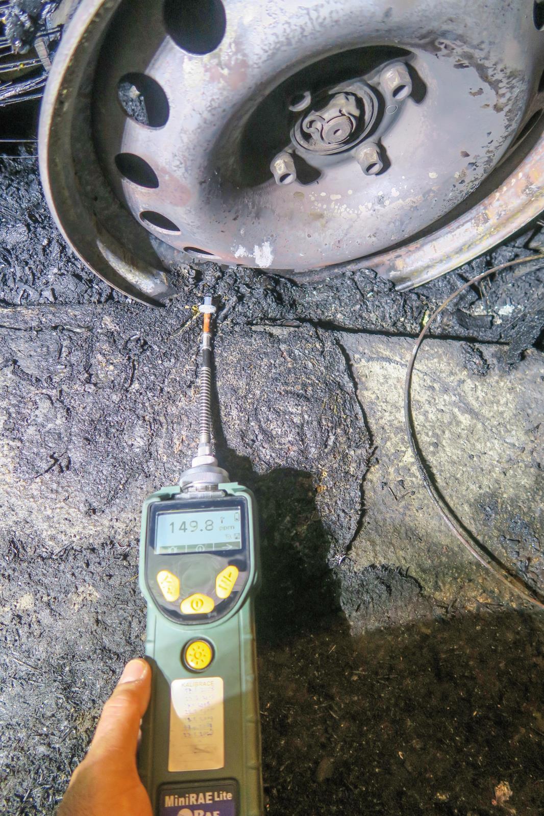 Po likvidaci požáru v každém pracovišti bylo přenosným detektorem ohledáno jak místo, kam byla hořlavá látka před vznikem požáru situována, tak i ostatní prostor požářiště. Vždy byla zaznamenána nejvyšší naměřená hodnota koncentrace v ppm (miliontina celku) pro dané místo. Časově byla měření započata v den požáru po odvětrání jednotlivých požářišť a dále byla opakována v následujících čtyřech dnech po požáru. Pátý den byla všechna pracoviště ohledána policejním psem vycvičeným na detekci akcelerantu hoření a z detekovaných míst byly vyšetřovateli požárů zajištěny stopy, které byly po odběru opět změřeny přenosných detektorem již v určených obalech (skleněné lahve s uzávěrem twist-off) a následně předány do chemické laboratoře Třemošná pro provedení požárně technické expertízy za účelem identifikace látek v odebraných stopách.