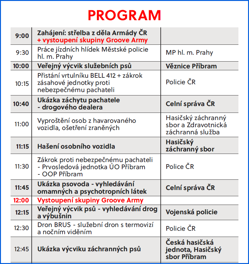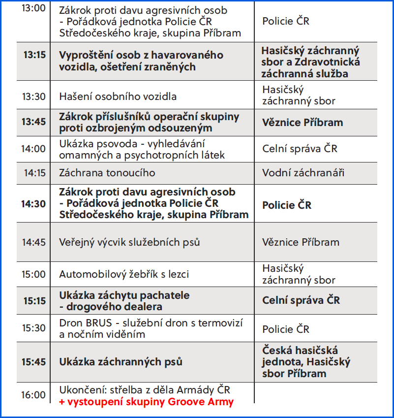 Kromě profesionálních a dobrovolných hasičů se velmi povedené akce zúčastnilo mnoho dalších složek a subjektů, které mají v oblasti prevence a bezpečnosti své místo. Ukázkami činnosti se tak návštěvníkům za opakovaného potlesku představila nejen Policie ČR, Městská policie Příbram a Městská policie hlavního města Prahy, ale také Zdravotnická záchranná služba Středočeského kraje, Armáda ČR, Celní správa Příbram, Vězeňská služba ČR, Český červený kříž, kynologové i další zájmové spolky a organizace.