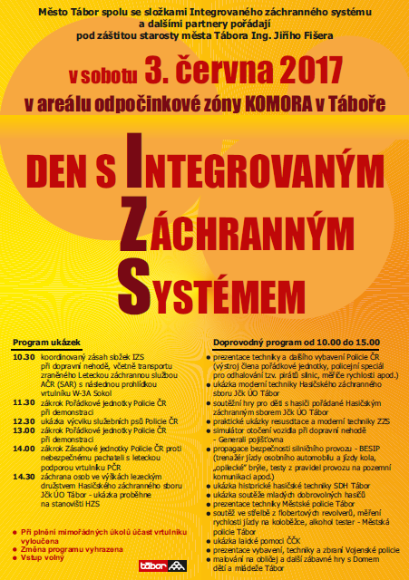 Sobota 3. června bude v Táboře patřit všem, kdo chtějí vidět všechny složky integrovaného záchranného systému. Město Tábor připravuje společně s hasiči, policisty a záchranáři v areálu odpočinkové zóny "Komora" Den s integrovaným záchranným systémem.