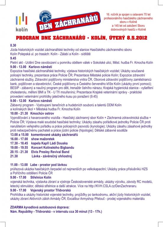 V úterý 8. května 2012 se v Kolíně uskuteční 16. ročník Dne záchranářů. Celodenní akce nabídne to nejlepší z integrovaného záchranného systému. Více informací k programu v letáku.