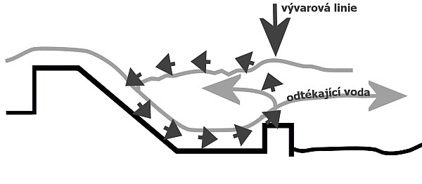 Člověk takto zachycený pak nemůže od jezu odplavat, protože je neustále strháván proudem zpět. Jakmile se dostane až pod přepad, je zatlačen proudem vody ke dnu a po chvíli ho voda zase tlačí nahoru. Tím zde rotuje, ztrácí orientaci a nemá čas na svou záchranu. Jeho priorita je najít hladinu a nadechnout se, než je zase tlačen ke dnu.