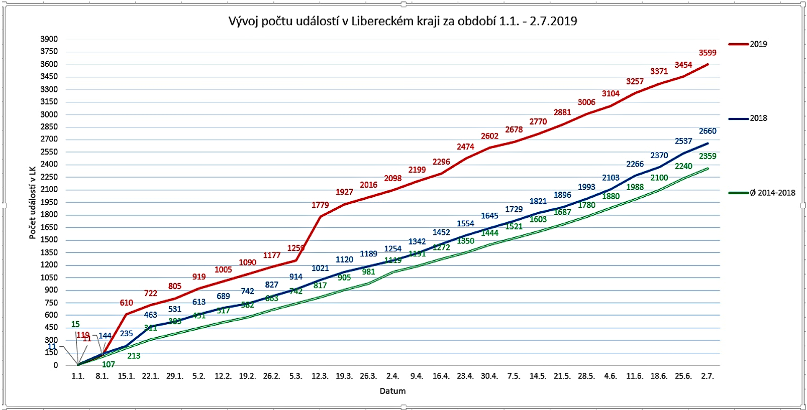 I když počet řešených událostí na území Libereckého kraje dosáhl v roce 2018 historického maxima (5700 mimořádných událostí), tak letošní rok jej určitě výrazně překoná. Zejména meteorologické jevy na začátku ledna 2019 (vydatné sněžení a silný vítr) a pak velmi silný vítr 10. a 11. března 2019 způsobily velký počet zásahů hasičů zprvu na popadané stromy, poškozené budovy a střechy nebo dopravní nehody. Následné sucho pak zapříčinilo i vysoký počet požárů. Počet řešeným mimořádných událostí je tak nyní o téměř 40% vyšší než v roce 2018 a o více než 50% vyšší oproti pětiletému průměru.