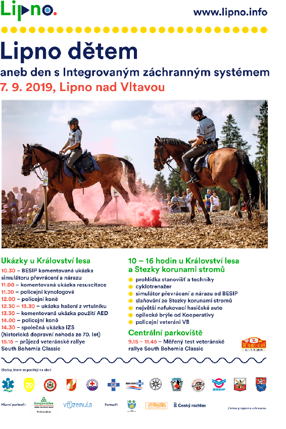 Lipno dětem aneb den s integrovaným záchranným systémem nabídne zábavu nejen dětem, ale i dospělým. Těšit se můžete na ukázky a zásahy profesionálních hasičů, ale také policistů a záchranářů. Budete si moci prohlídnout techniku policie, hasičů, záchranné služby, horské služby nebo vodní záchranné služby.