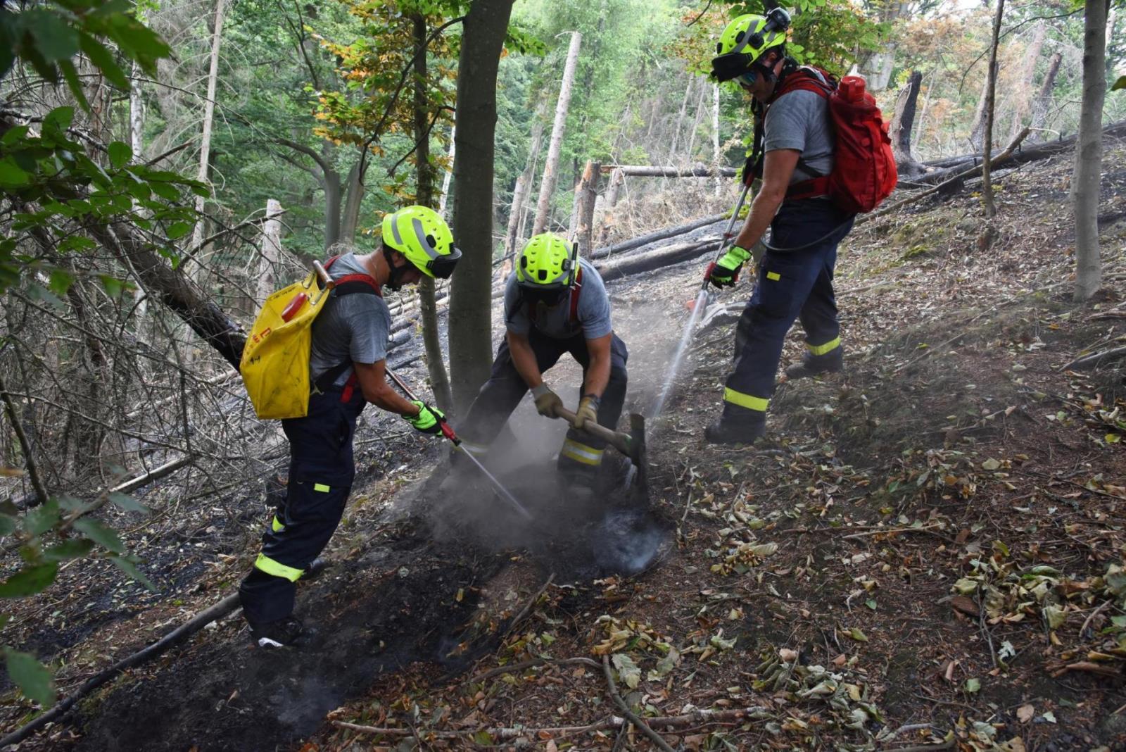 Pod Právčickou bránou_14.8.202219:30 Celý dnešní den byl zaměřen na obchůzkovou kontrolu požářiště, především na ráno označené lokality leteckým průzkumem. Na Křídelní stěně jsme zasahovali pomocí jednoduchých hasebních prostředků, překopávali jsme a prolévali terén. V oblasti Právčické brány, Tetřevých stěn, Bouřňáku a Větrovece bylo nalezeno během dne několik doutnajících míst a drobná ohniska, např. doutající pařezy. V dopoledních hodinách nám pomáhali vrtulníky ze SRN, odpoledne jsme si vodu na požářiště dopravovali hadicemi či ve vodních vacích. Dnešní den se obešel bez zranění zasahujících hasičů. V noci budeme i nadále provádět kontrolu požářiště. Dohlídkovou činnost vykonává i nadále 72 dobrovolných hasičů s 35 kusy techniky, celkem 21 dobrovolných jednotek. Na místě operuje celkem 6 profesionálních jednotek, 3 z HZS Ústeckého kraje a 3 ze školících zařízení HZS ČR.