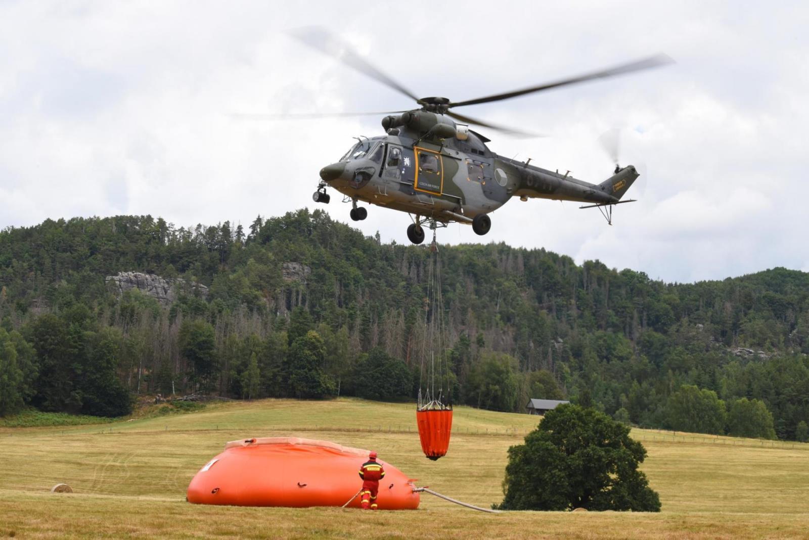 14:15 K naší stávající letecké podpoře (6 vrtulníků, 5 letadel) přibylo 5 německých vrtulníků Bundeswehru, každý s bambi vakem na 2 tisíce litrů. Zasahují v oblasti Borového dolu.