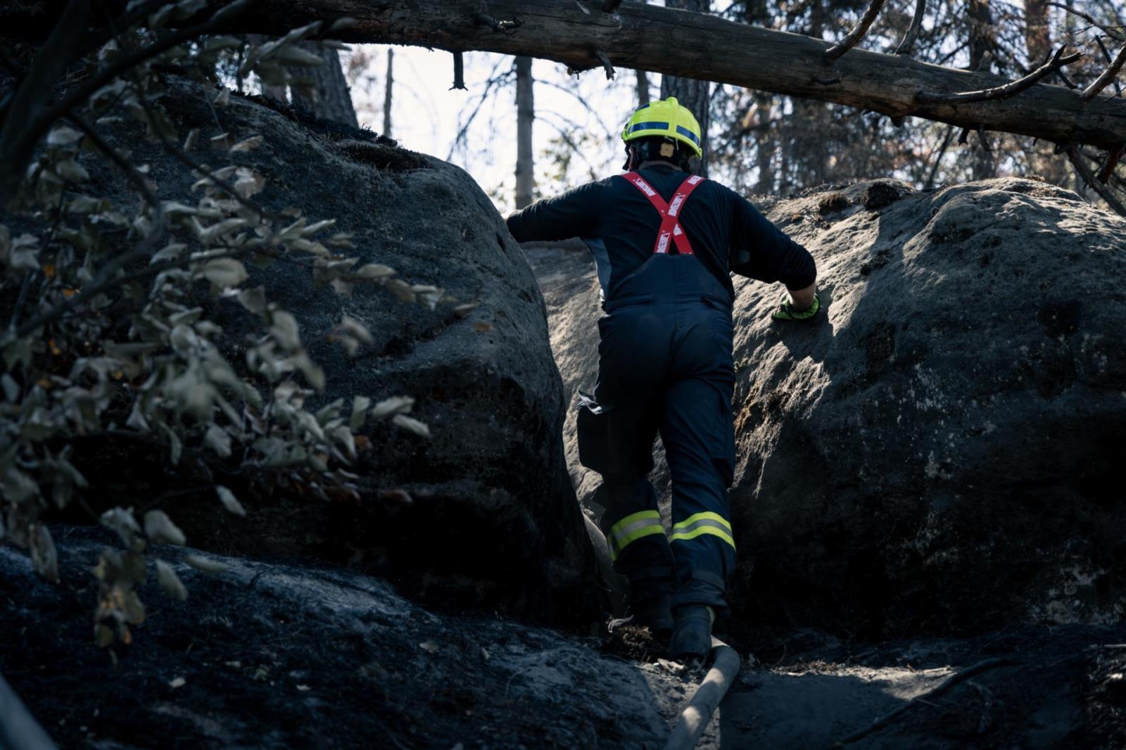 slovenských vrtulníků musel odletět na pravidelnou revizi. Všechny síly teď směřujeme do oblasti nepřístupných míst kolem Pravčické brány, skal nad Hřenskem v západní části a na oblasti Větrovec a Bouřňák. Z jednotlivých sektorů chodí pozitivní zprávy a ohniska se objevují v menší intenzitě než v minulých dnech. Není také takové vedro a vítr je slabší než jsme čekali. Hasičům se pracuje lépe než v minulých dnech. Nezaznamenáváme výraznější plamenné hoření, ohniska jsou spíše jako žhnutí podrostu a jehličí.