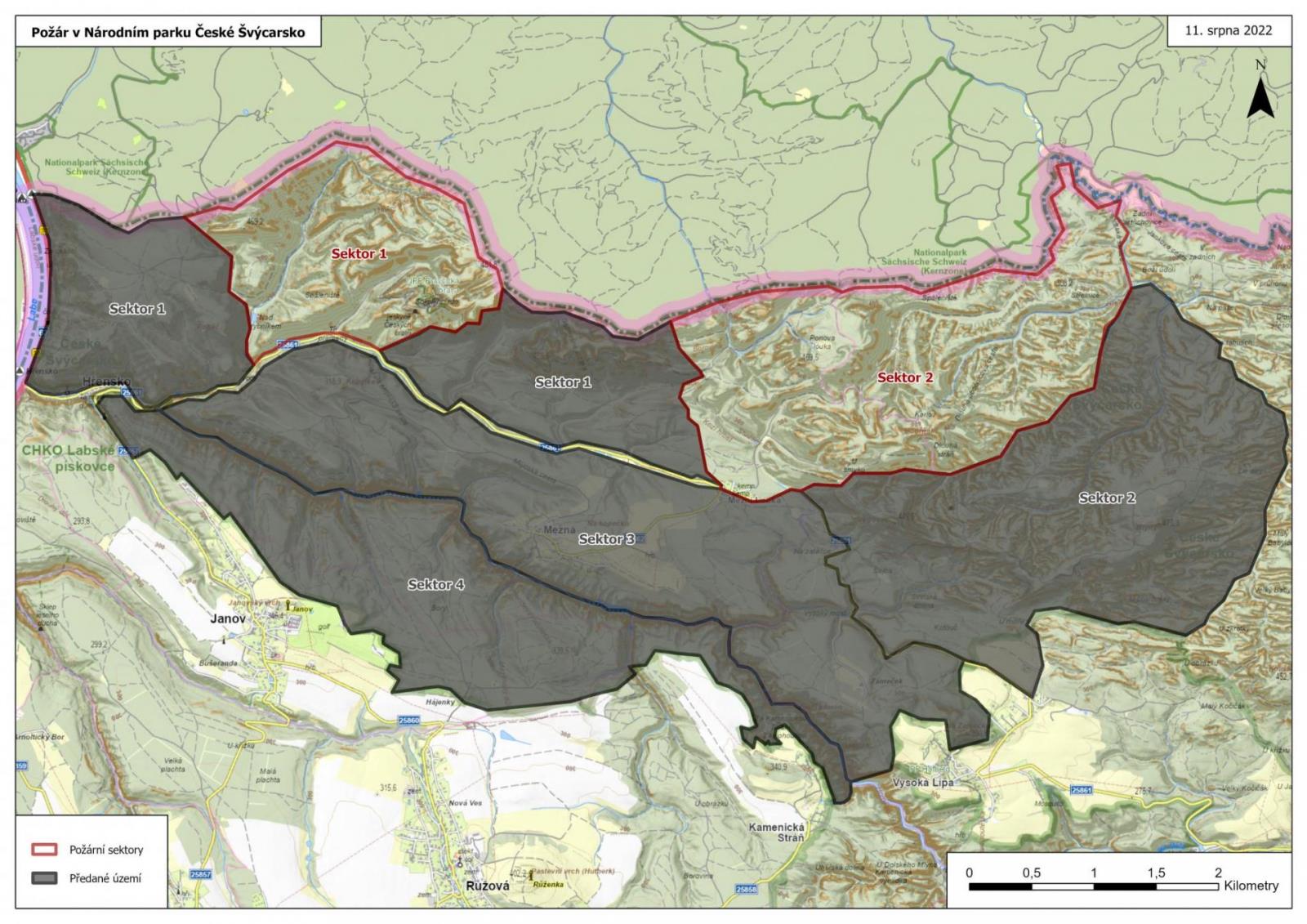 13:30 Aktuálně předáváme do správy NP větší část území, které bylo součástí zásahové zóny. Už před pár dny jsme kompletně dočistili od ohnisek a předali sektor č. 4, nyní se nám to samé podařilo i se sektorem č. 3. Ze sektoru č. 1 jsme dnes předali prostor nad Hřenskem, ze sektoru č. 2 je to území od České silnice až po lokalitu kolem Větrovce. Díky velkému nasazení všech hasičů v terénu a využití letecké techniky se nám podařilo významně snížit plochu, na které zasahujeme. Jednotky se pohybují nyní na území o rozloze asi 50 hektarů, celková plocha námi vymezených sektorů, které ještě nejsou předány NP je asi 785 hektarů.