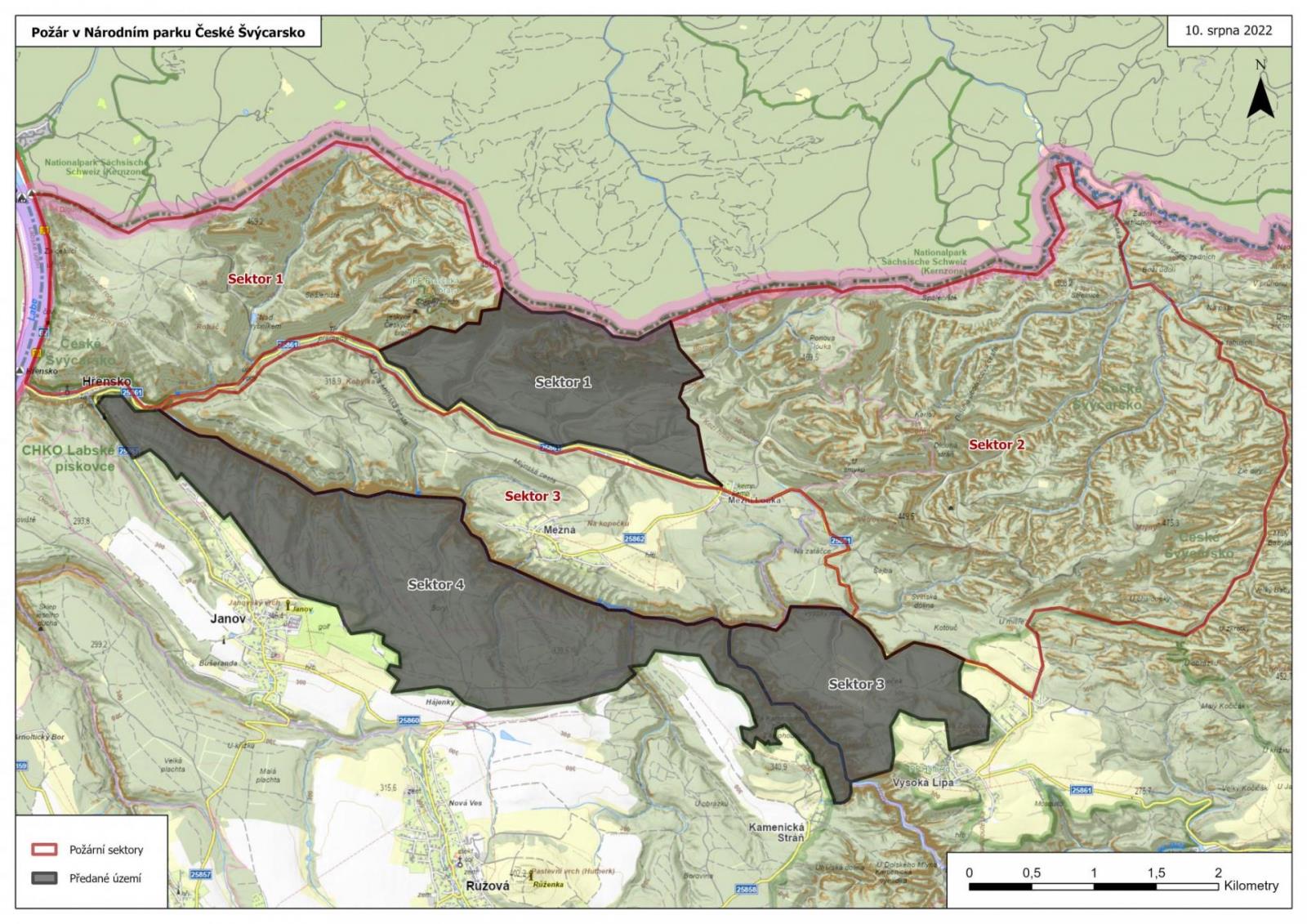 10:00 Během dopoledne jsme předali správě NP další část území, konkrétně část sektoru č. 1. Je to plocha na východ od Pravčické brány, přes Gabrielinu stezku - viz mapa. Předané území je z velké části z východu lemováno vytvořenou obrannou linií, kterou ve spolupráci s NP prořezáváme a čistíme od dřeva tak, aby byla dostupná pro zásahovou techniku až na sever k hranici s Německem. Platí, že na předaném území musí probíhat pravidelné hlídky - zajišťuje si správa NP. Už postupně redukujeme sily a prostředky z republikových odřadů. Z HZS krajů jsou tu dva druhy odřadů: a) určené k hašení v terénu, b) určené k čerpání a zajištění dálkové dopravy vody velkokapacitními čerpadly. Čerpací odřady zůstávají podle současných předpokladů až do pátku. Odřady pro hašení budou postupně končit. Dnes odjede asi stovka hasičů z HZS krajů Olomouckého, Zlínského, Pardubického a Královéhradeckého. Následující dny bude redukce pokračovat. V terénu pracujeme na tom, abychom uvolnili Národnímu parku další části území. K otevření komunikací bude možné přistoupit až ve chvíli, kdy to bude pro veřejnost bezpečné. Opatření, za jakých okolností a komu bude vstup umožněn, bude koordinovat Policie ČR, zástupci NP a obce.