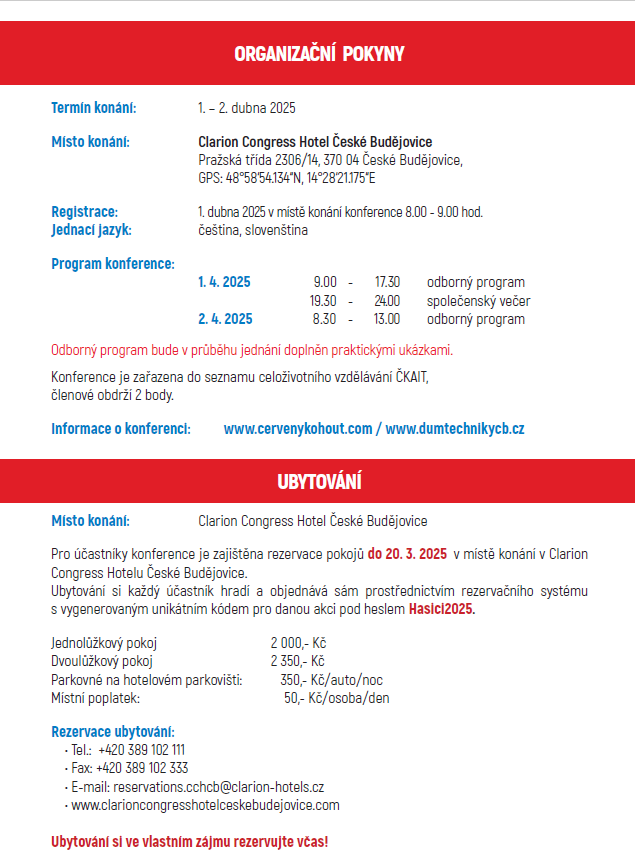 Již tradičně budou konferenční prostory Clarion Congress Hotelu České Budějovice hostit odborníky a návštěvníky konference požární ochrany - Červený kohout. Tradiční odborná konference s mezinátorní účastí se letos bude konat ve dnech 1. a 2. dubna.
