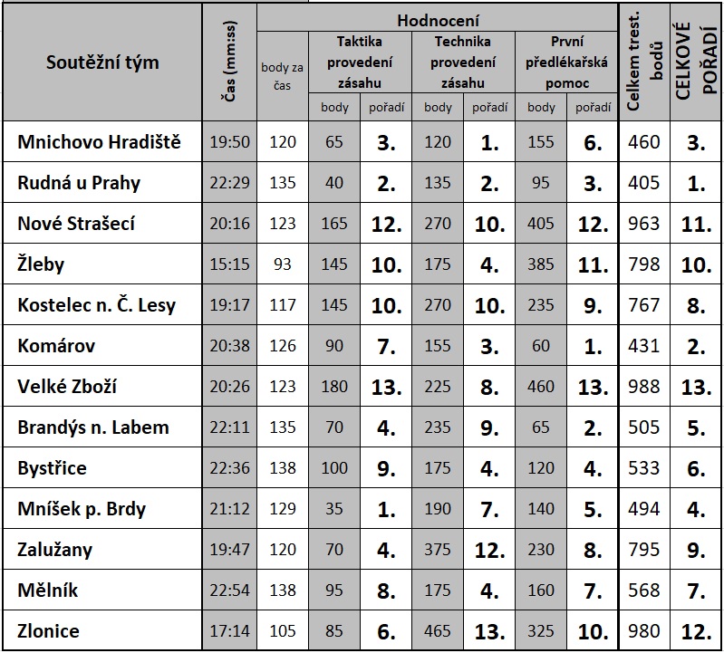 Nejméně trestných bodů v součtu jednotlivých kritérií za čas a od rozhodčích za taktiku, techniku a předlékařskou pomoc získalo družstvo z Rudné. S odstupem 26 bodů obsadili druhé místo hasiči z Komárova na Berounsku a třetí příčku vybojoval tým z Mnichova Hradiště z Mladoboleslavska, který posbíral ještě o 29 bodů více.