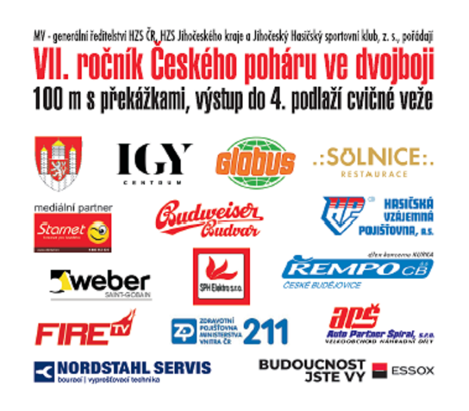 MV - generální ředitelství HZS ČR, Hasičský záchranný sbor Jihočeského kraje a Jihočeský Hasičský sportovní klub, z. s., zvou na VII. ročník Českého poháru ve dvojboji, kdy ve čtvrtek 6. června 2019 zavítá do Českých Budějovic atraktivní závod v disciplínách požárního sportu.