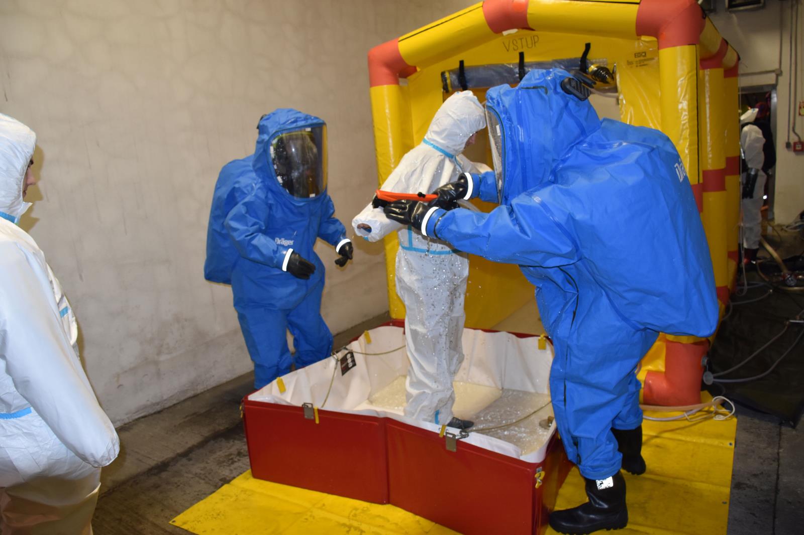 25. 4. 2023 9:00 Havarovala do dávka převážející kontejner s kyselinou dusičnou. V autě zůstaly dvě zaklíněné osoby a z porušeného kontejneru unikala kyselina. Úkolem jednotek, zasahujících v protichemických oblecích, bylo postarat se o zraněné, dekontaminovat je i sebe v zřízeném dekontaminačním pracovišti. Odčerpat kyselinu dusičnou z porušeného barelu a vyteklou dekontaminovat a odstranit. Cvičilo 7 hasičských jednotek, Policie ČR a Zdravotnická záchranná služba. Oba tubusy tunelu byly po dobu cvičení uzavřeny a doprava byla odkloněna.