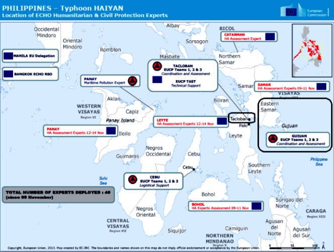 Okamžitě po tajfunu Haiyan vyslala Evropská komise v rámci Mechanismu civilní ochrany EU na nejvíce postižená místa celkem 25 odborníků z oblasti civilní ochrany pro vyhodnocení situace a koordinaci humanitární pomoci států EU. Vyslány byly postupně tři týmy Střediska pro koordinaci odezvy na mimořádné události EU (Emergency Response Coordination Centre - ERCC) – Alpha, Bravo a Charlie. A právě v týmu Charlie byl také příslušník HZS Karlovarského kraje kpt. Ing. Miroslav Lukeš.