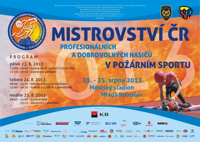 16. 8. 2013 (Kateřina Hlaváčková) - V pátek 23. 8. 2013 bude slavnostně zahájeno Mistrovství ČR profesionálních a dobrovolných hasičů v požárním sportu 2013. Sportovní klání bude probíhat na Městském stadionu v Mladé Boleslavi, a to až do neděle 25. 8. 2013.