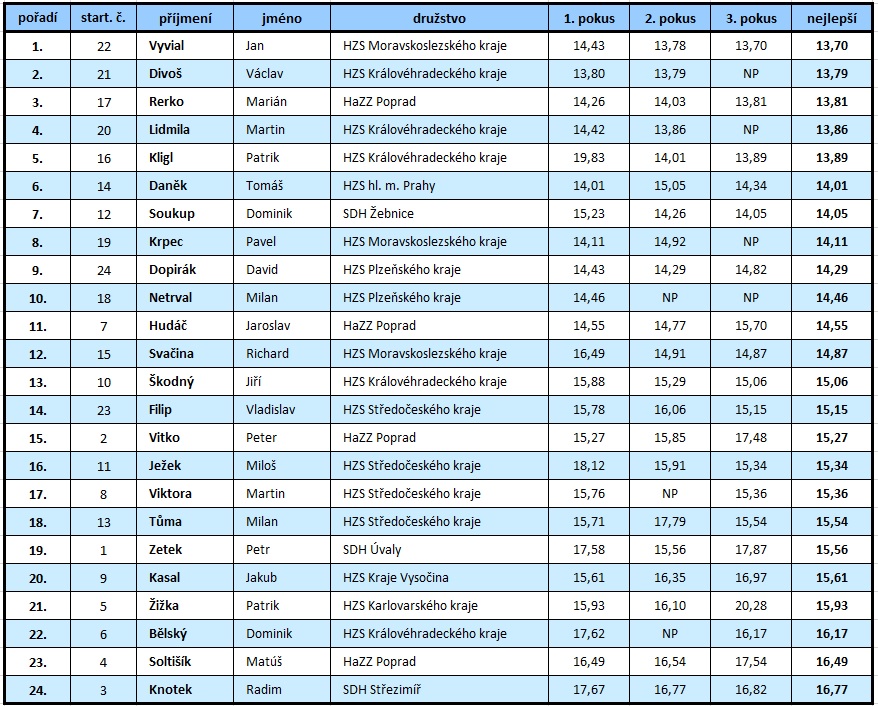 Letos se do soutěže přihlásilo celkem 24 mužů a 9 žen. Ve startovní listině se objevilo také kvarteto profesionálních hasičů ze slovenského Popradu, což dalo mítinku mezinárodní nádech. V základním kole předvedl každý z účastníků tři pokusy. Do finálové části pak postoupilo nejlepších 16 mužů a 8 žen. O konečné umístění se bojovalo vyřazovacím způsobem formou pavouka, kdy o nasazení rozhodoval čas z kvalifikace.